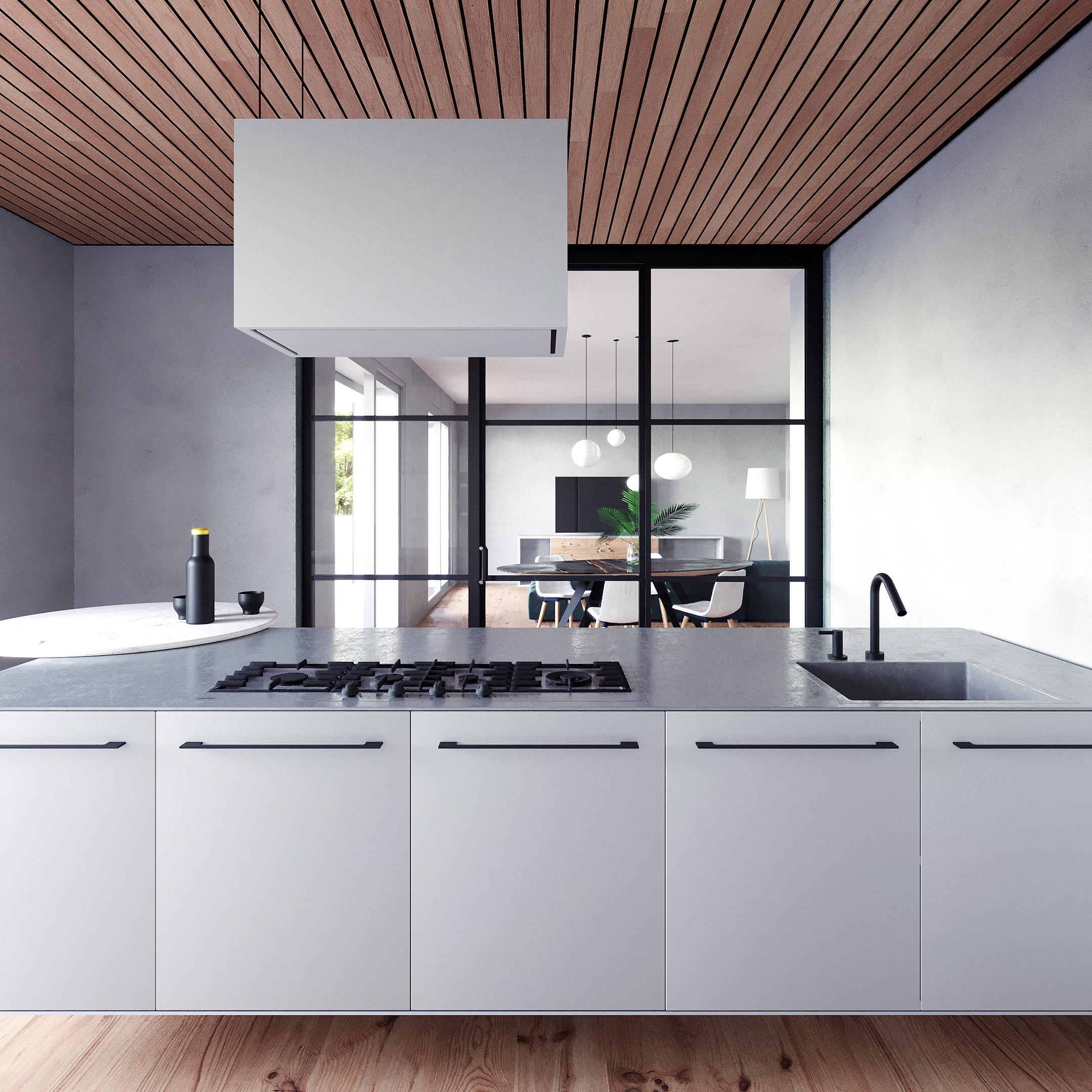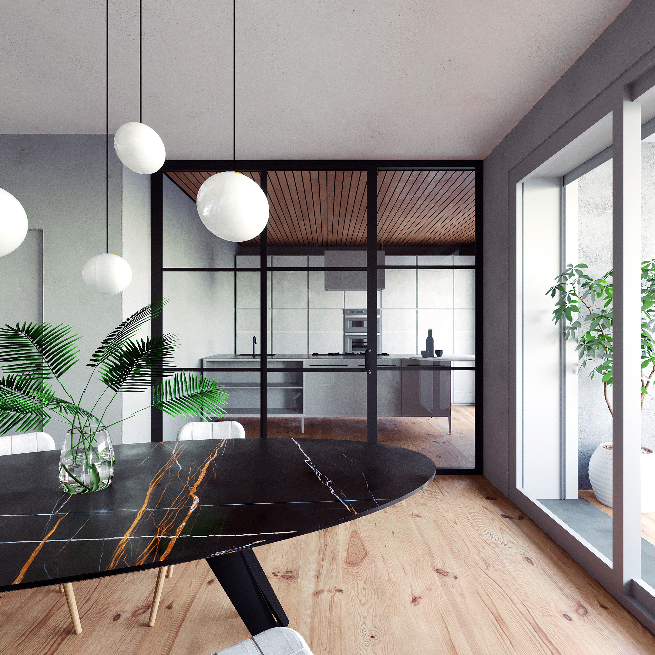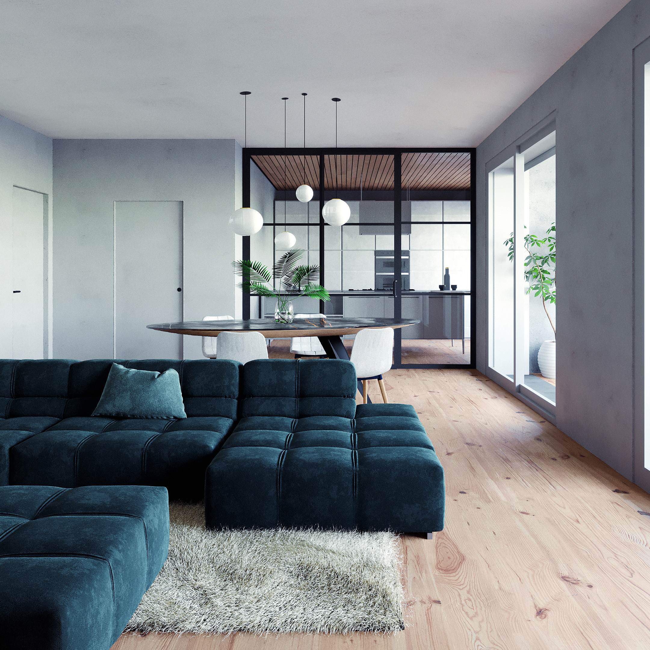 Vetrata scorrevole con telaio in ferro per dividere gli ambienti giorno.