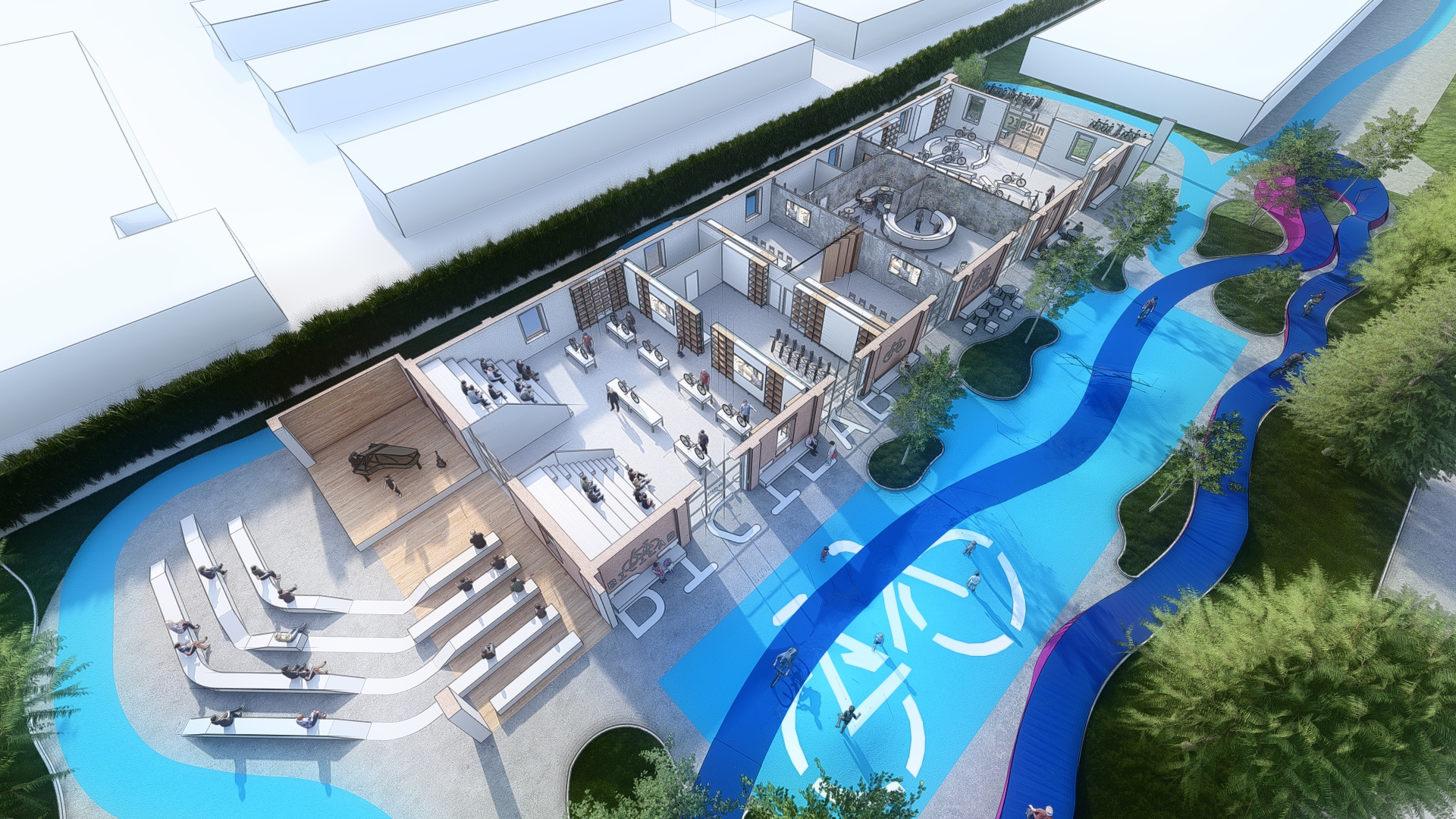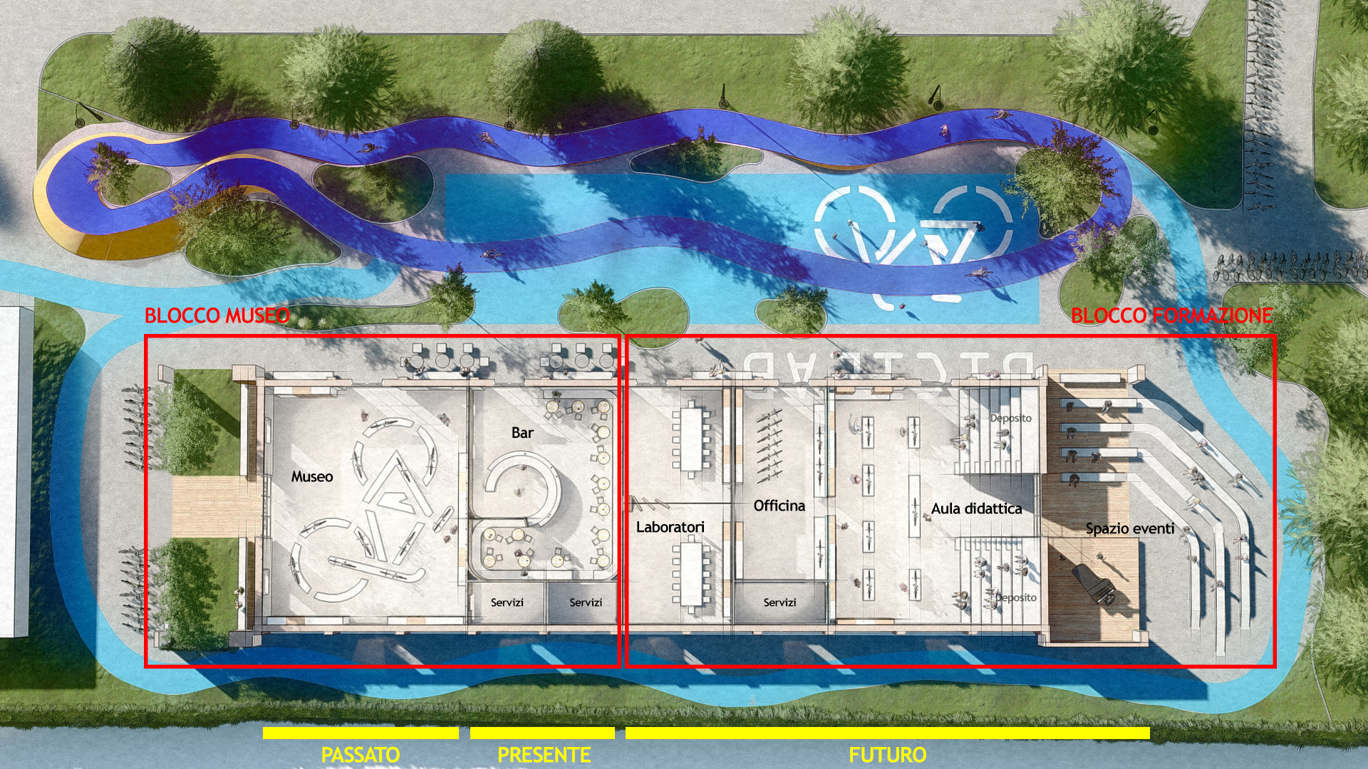 L’obiettivo posto alla base della progettazione è quello di creare un nuovo luogo della città in cui ci sia la possibilità per il cittadino di fare nuove esperienze e di confrontarsi in modo attivo con diverse generazioni tramite lo strumento della bicicletta.